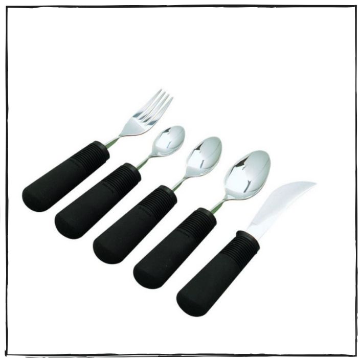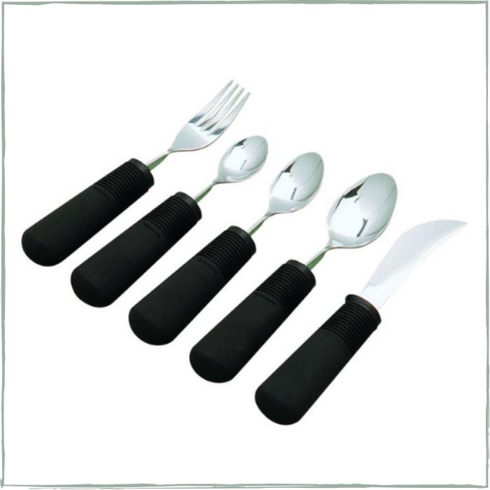 Good Grips Adapted Cutlery is ideal for using when bending the wrist, grasping, or eating motions become difficult. All the cutlery has a soft cushioned grip that helps the user to keep the utensil in their hand. The soft and comfortable handle will adapt to any grip. Each piece has a special twist built into the metal shaft that allows spoons and forks to bend to any angle. They can be used with the left and right hand. The Good Grips Rocker Knife ensures that you need minimal arm strength when cutting.
